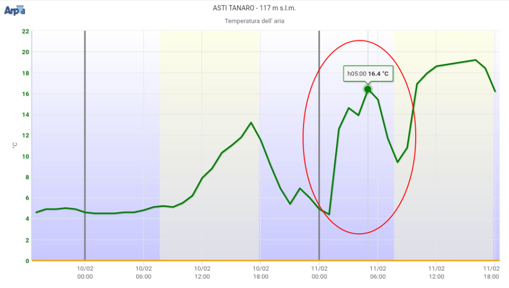 Nel corso della notte i venti di caduta irrompono anche sulle pianure: ad Asti intorno alle ore 5 si raggiunge un picco massimo di +16,4°C. Per una zona di fondovalle come quella dove si trova il capoluogo astigiano (Valle Tanaro) una tale temperatura durante le ore notturne in un mese invernale è estremamente rara e forse del tutto inedita. Infatti, se tali valori sono già stati riscontrati in passato sulle nostre colline, raggiunte più facilmente dagli sbuffi miti del foehn, in pianura e lungo i fondovalle di norma nelle ore notturne domina l’inversione termica con coriacei sacche d’aria fredda difficili da scalzare del tutto. Ancora più notevole è il dato di Castell’Alfero (AT) sul fondovalle del Versa, località nota per essere tra le più fredde in assoluto di tutta la pianura piemontese: qui la temperatura di +16,6°C misurata intorno alle ore 2 si discosta di 20,1°C dalla media delle temperature minime di febbraio (-3,5°C nel periodo 1999-2019).