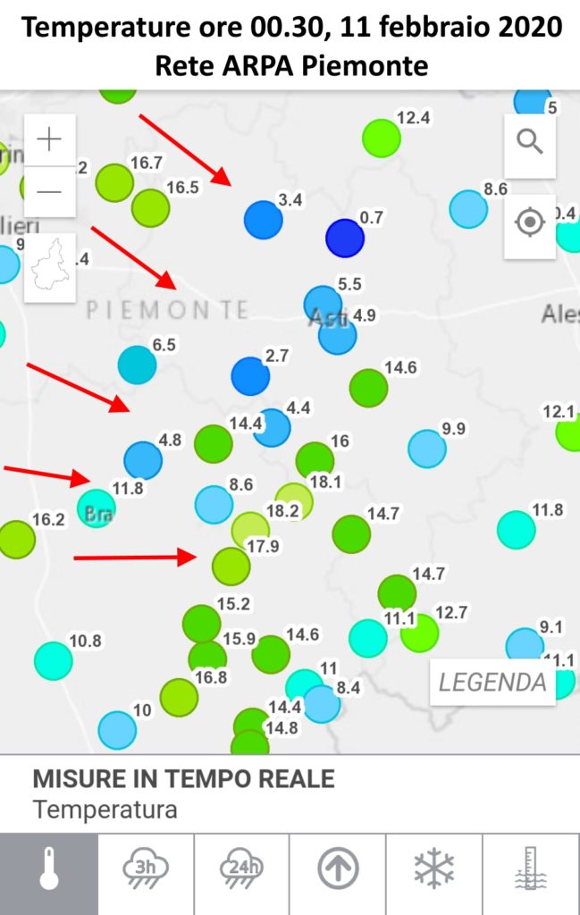 Alle ore 00.30 dell’11 febbraio questa è la situazione termica rilevata dalle centraline della rete ARPA Piemonte: il foehn sta irrompendo da nord-ovest sul Monferrato e da ovest sulle Langhe. Il vento caldo ha già raggiunto le pianure dell’Astigiano occidentale (16,5°C a Buttigliera d’Asti), mentre nei fondovalle interni del Monferrato resistono ancora sacche d’aria fredda che verranno scalzate nel giro di poche ore (0,7°C a Castell’Alfero, 2,7°C a San Damiano d’Asti, 3,4°C a Montechiaro d’Asti). Sulle Langhe Albesi la temperatura è già schizzata fino ai 18,2°C di Treiso, temperatura che peraltro non verrà più raggiunta durante il pomeriggio.
