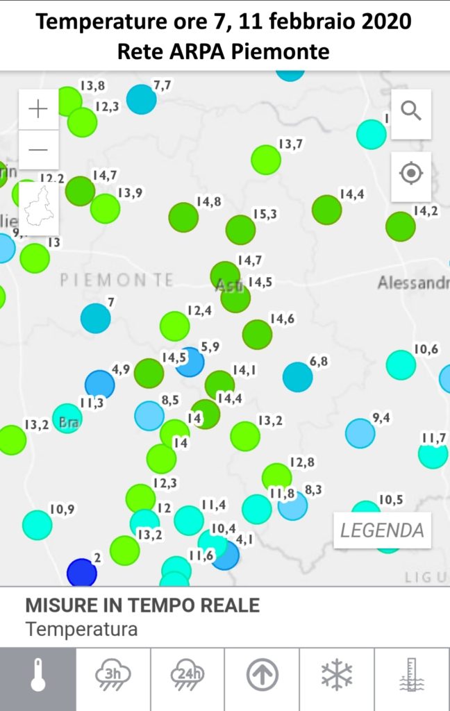 Le temperature più alte misurate tra Langhe, Roero e Monferrato oggi, 11 febbraio 2020 (rete ARPA Piemonte):