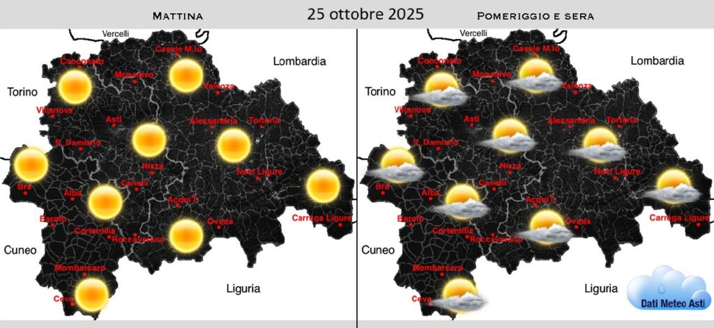 Temperature: in calo, specie nei valori minimi in pianura. Estremi termici giornalieri ad Asti: +4°C / +17°C. Minime: -1/0°C sui fondovalle, +1/+5°C su pianure e basse colline (100-300 m), +6/+9°C su medio-alte colline (>300 m). Massime: ovunque comprese tra 14 e 18°C.