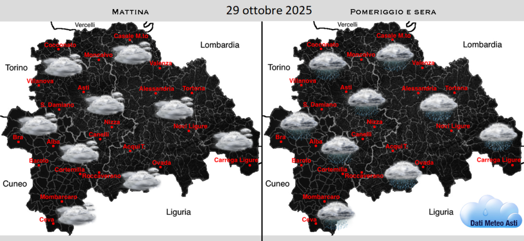 Giovedì 30 ottobre: coperto con piogge diffuse e rovesci a tratti sull’Alessandrino tra la notte ed il primo mattino (ore 00-09), asciutto con parziali schiarite durante il resto della giornata. Temperature in lieve aumento: minime 8/12°C e massime 13/17°C.