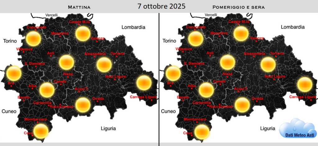 Temperature: minime in netto calo in pianura. Estremi termici giornalieri ad Asti: +5°C / +24°C. Minime: 1/3°C sui fondovalle, 4/7°C in pianura e 8/12°C in collina. Massime: ovunque comprese tra 21 e 25°C.